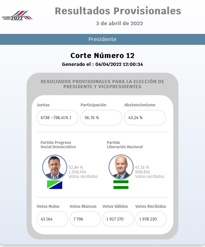 Nachdem in der ersten Wahlrunde im Februar keiner der Präsidentschaftskandidaten mehr als 40 Prozent der Wählerstimmen erzielte, standen sich am Sonntag Rodrigo Chaves und José Figueres, Kandidat der Partei der Nationalen Befreiung (PLN), in einer Stichwahl gegenüber (amerika 21 berichtete). Nach der letzten vorläufigen Stimmenauszählung des TSE konnte Chaves 52,84 Prozent der Stimmen für sich gewinnen, während sein Kontrahent 47,16 Prozent erzielte. Das amtliche Endergebnis wird für die kommenden Tage erwartet.